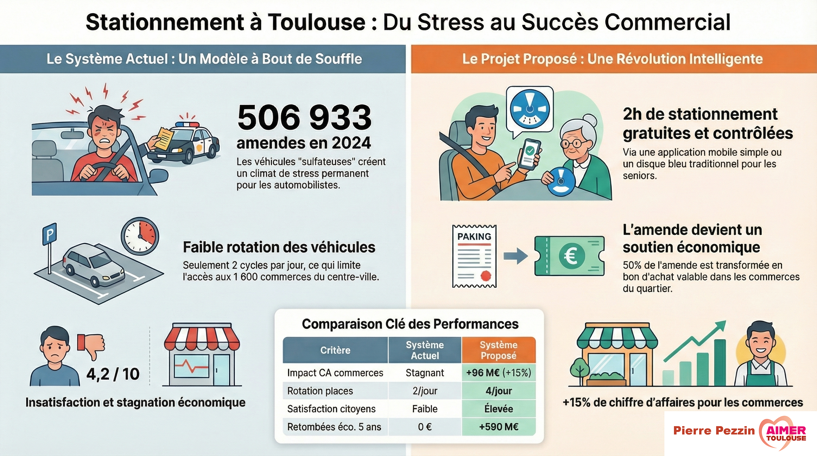 Le système actuel de stationnement à Toulouse génère un paradoxe toxique : 506 933 forfaits post-stationnement en 2024, soit plus de 500 000 amendes qui créent un climat de stress permanent pour les automobilistes. Les cinq véhicules LAPI (sulfateuses) patrouillent les 19 000 places payantes avec une efficacité redoutable, contrôlant jusqu’à 90 000 véhicules par mois. Résultat : les conducteurs évitent le centre-ville, la rotation des places stagne à 2 cycles par jour, et les 1 600 commerces du cœur de ville perdent en attractivité malgré leurs 220 000 m² de surface commerciale.[1][2][3][4]