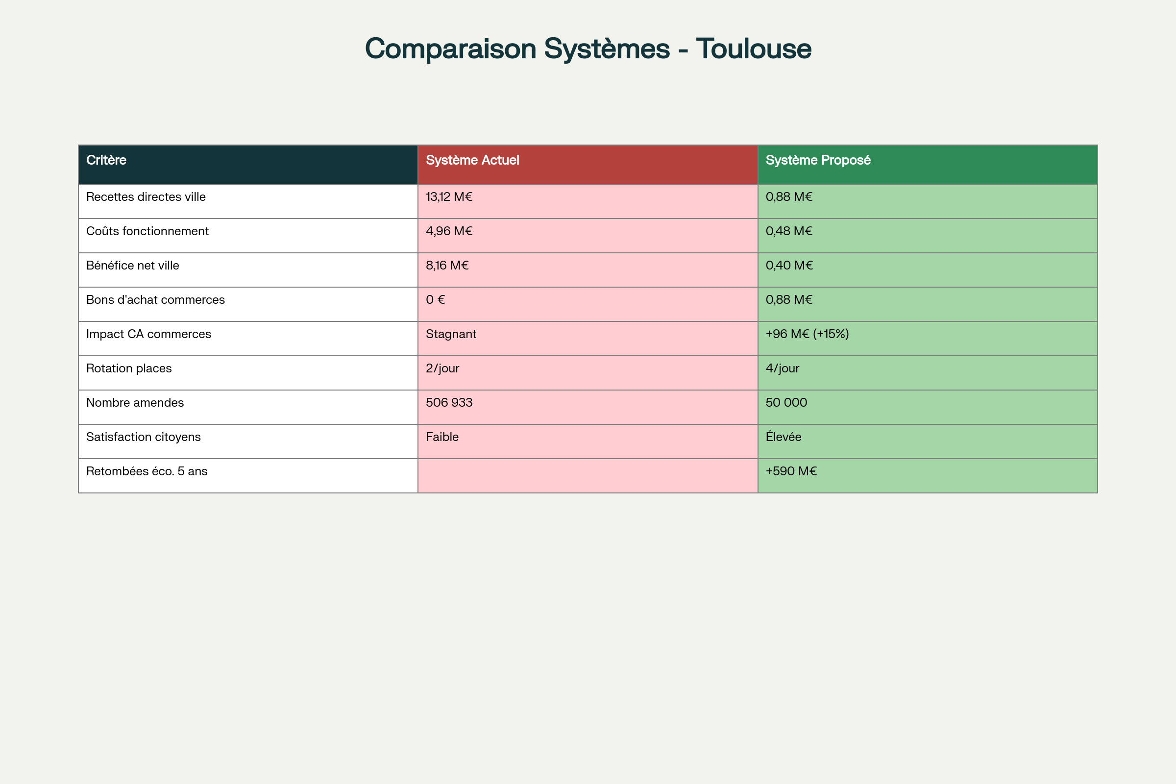 Le bilan financier actuel montre 13,12 millions d’euros de recettes pour la ville, mais au prix d’un mécontentement généralisé et d’un impact négatif sur le commerce local. La perception des Toulousains est claire : ils jugent sévèrement la facilité de stationnement dans le centre avec une note moyenne de 4,2 sur 10.[5][6]